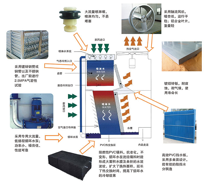 蒸發式冷凝器是制冷、空調系統中的主要熱交換設備,其工作原理是:制冷、空調系統中壓縮機拍出的制冷劑高壓過熱氣體經過蒸發式冷凝器中的冷凝排管,使高壓高溫氣態的制冷劑與排管外的噴淋水和空氣進行熱交換,即氣態制冷劑由上部進氣口進入冷凝排管后自上而下逐漸被冷凝成為液態制冷劑。